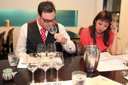 Conventional wine glasses are suitable for tasting and smelling “sake”. When they have a Japanese meal in a Japanese restaurant, they usually aren’t served “sake” in a wine glass. On this occasion, however, they are not there to enjoy a meal, so the “sake” tasting proceeds in whatever way the Australian sommeliers consider best.