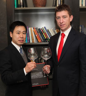 Photo: Mr.Iga and Mark Baulderstone, CEO of Riedel Asia Pacific. Mr. Iga won the prize and received high-quality crystal wine glasses at the blind wine tasting competition sponsored by Riedel.